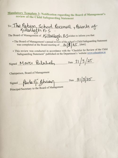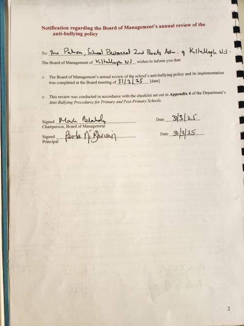 Policies are reviewed and updated as necessary by the Board of Management in consultation with staff, parents, and, where appropriate, pupils. Updated policies are approved by the Board and then made available for the school community.